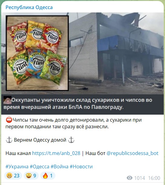 В проросійському телеграм-каналі «Республика Одесса» з’явилась інформація, що обстріл підприємства в Павлограді (Дніпропетровська область) спровокував детонацію, яка спричинила серйозну руйнацію будівлі. Автор повідомлення намагається вдаватись до іронічних оцінок, мовляв, це так чіпси довго «детонували» і звичайні сухарики все «рознесли» . Однак це повідомлення є не тільки маніпулятивним, а ще й фейковим, бо поширена інформація не проходить перевірку фактами.