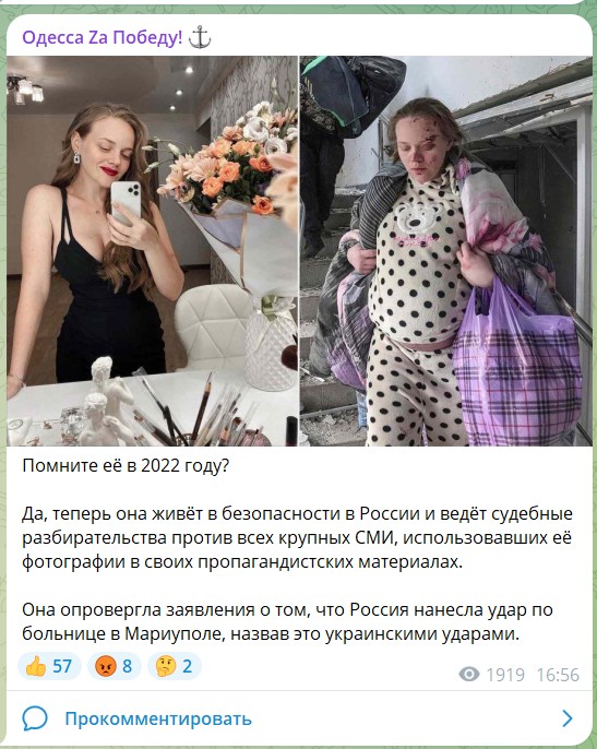 Минулого тижня проросійські джерела, орієнтовані на жителів Одеської області, переважно зосередили свою увагу на подіях в інших регіонах України. Так пропагандистський телеграм-канал «Одесса Za! Победу» поширив недостовірну історію про Маріанну Вишемирську. Вагітну жінку,  яка постраждала під час атаки пологового будинку в Маріуполі 9 березня 2022 року. У повідомленні стверджується, ніби вона позивається до західних ЗМІ і «спростувала» факт російського удару, назвавши його «українським». Усе це відповідає дійсності.